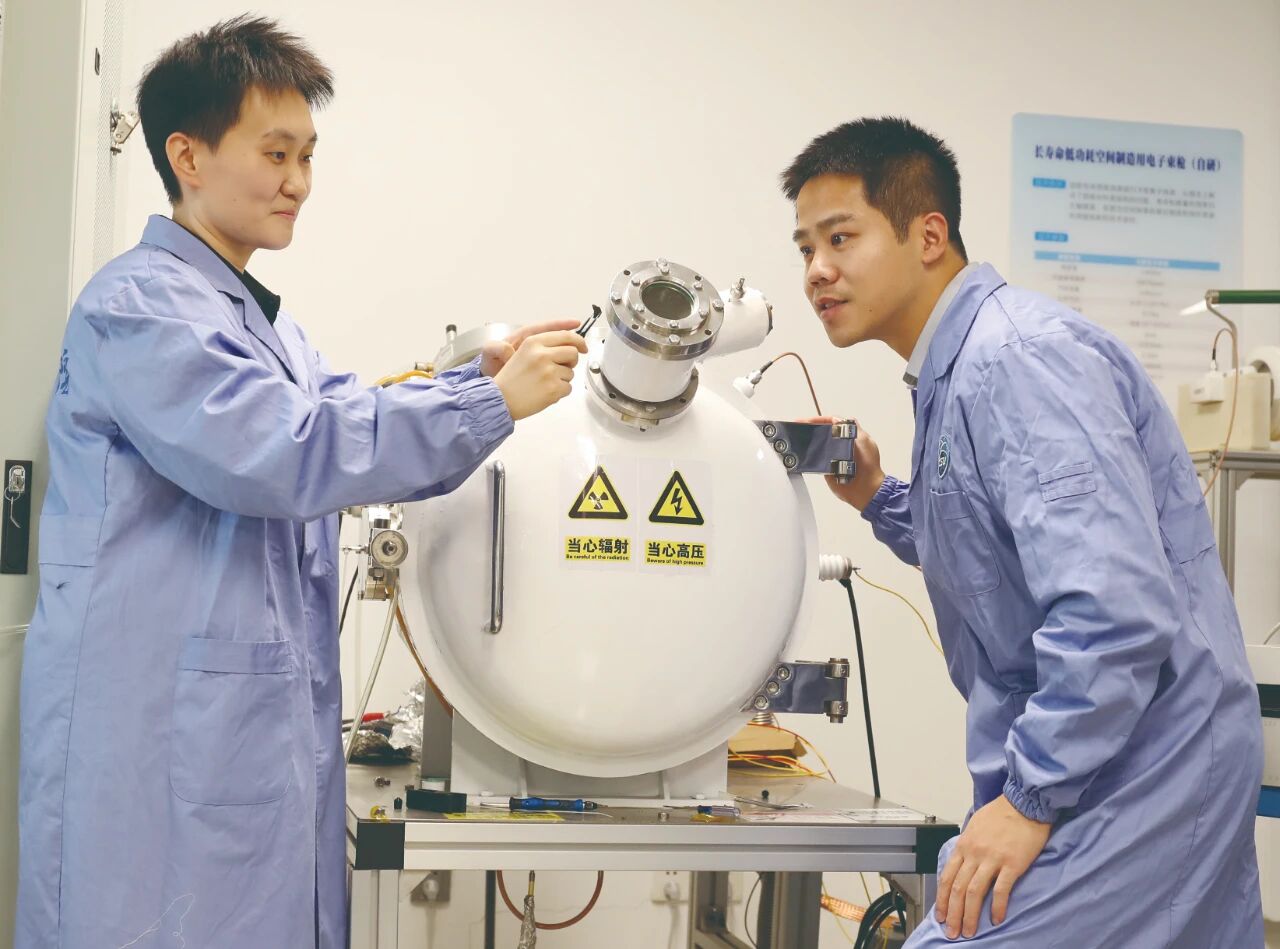 直博生张日晗(左)、贾卿峰观察确认电子束成型实验样品状态。